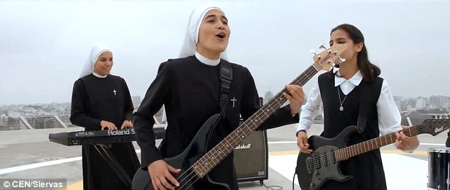 It shows the sisters playing both classical instruments as well as the drums and the electric and bass guitars while singing the catchy tune in their religious habits from a rooftop helipad.